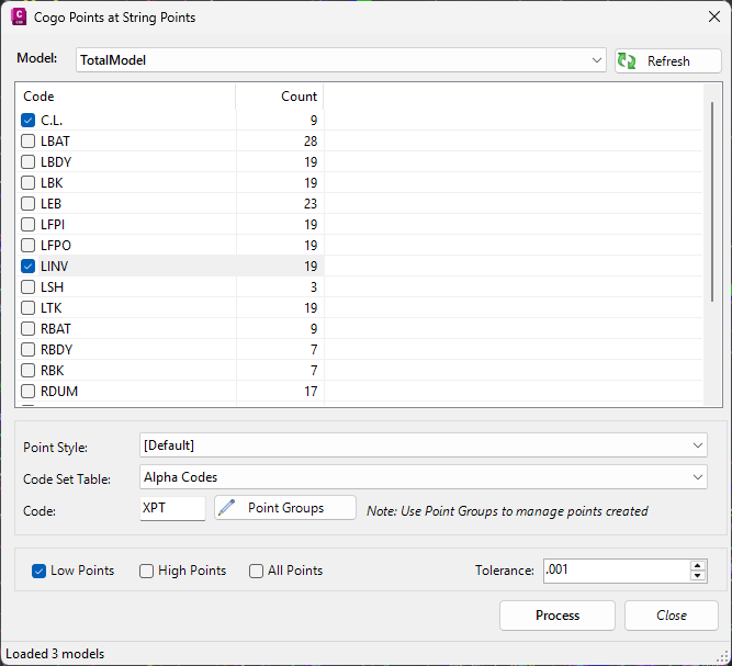 Displays available codes (e.g., "TOP", "TOE") and the count of points for each. Check the boxes to include/exclude specific codes in processing. Context Menu