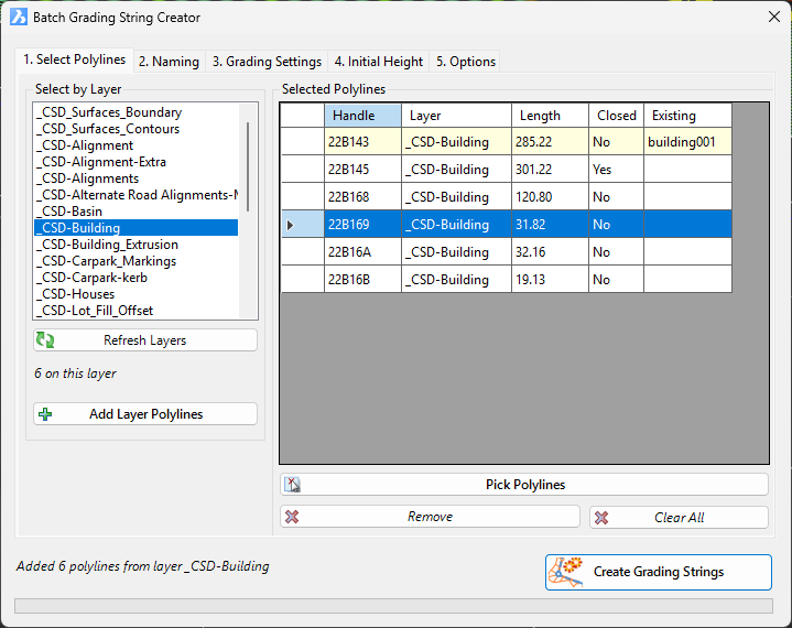 This command automates the process of creating grading strings by allowing the user to create gradings by selection of multiple polylines. Selection of polylines can be achieved by individual selection in the drawing or by layer/s containing polyline/s. Multiple tabs guide users through the process of selecting source geometry, defining naming conventions, setting design parameters, establishing initial grading elevations and configuring model integration.