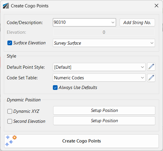 Set the COGO Code here. This entry will typically appear as the Description field of a COGO Point Block.