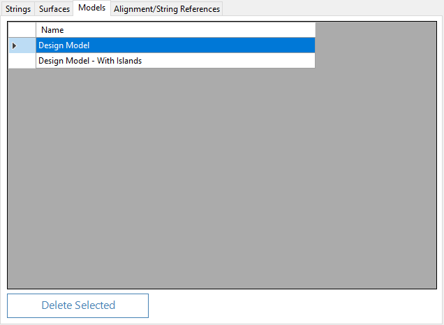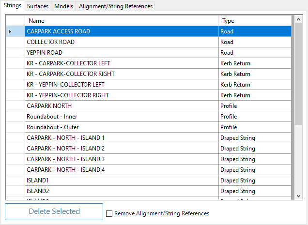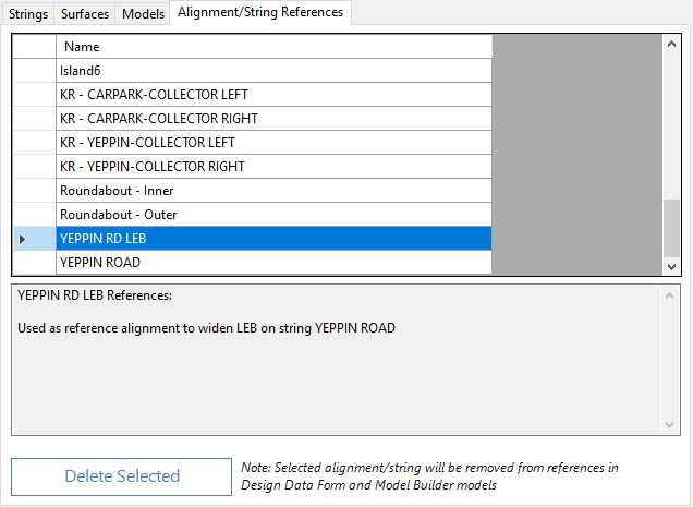 Models are updated as strings and alignments are removed. When Reference Alignments/Strings are deleted, the entries for these in the Design Data form of other strings will also be removed.