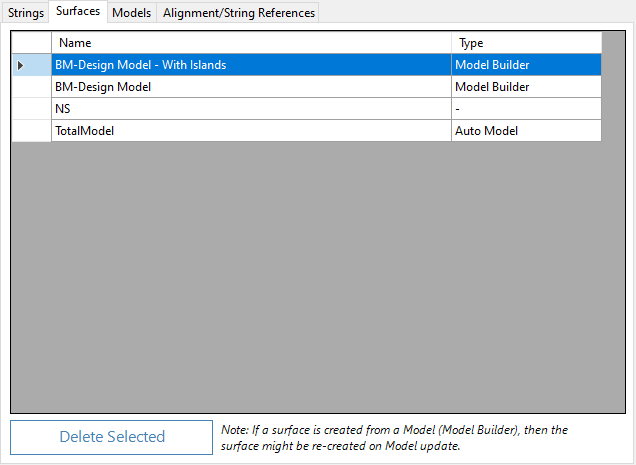 Note: Surfaces built from Models will be recreated when the models are updated.Delete Selected
