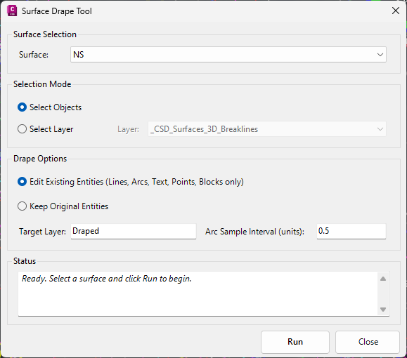 4. Run Drape Operation: Click "Run". If in "By Selection" mode, select objects in the drawing. The status window will show progress.