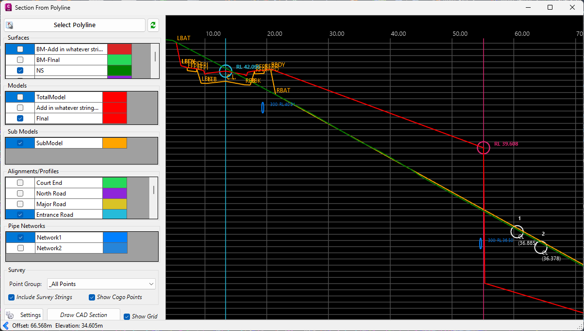 Creates dynamic cross-sections along a selected polyline, displaying multiple data sources (surfaces, models, sub-models, survey strings, and pipe networks) in an interactive 2D viewer. This allows engineers to visualise and analyse vertical profiles of the design.