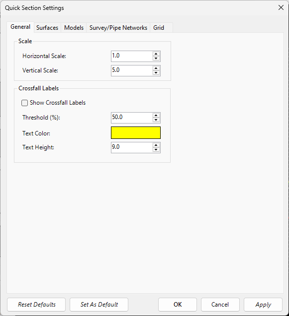 Opens the Quick Section Settings dialog to configure scales, intervals, and styles. General Tab