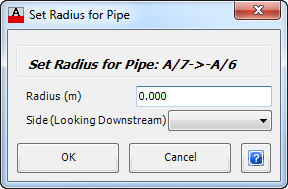 Set Radius for Pipe: Displays the number of the selected pipe. Radius (m) Enter the radius in metres of the curved pipe. Note: If zero is entered, the pipe remains (or is recreated) as a straight line. Side (Looking Downstream) Specify which side (Left or Right) the curve is to drawn when looking downstream. OK Select OK to apply the radius. Cancel Exit the form without applying any changes. After OK has been clicked, the selected straight pipe will be changed to a curved pipe. The straight portion (now the chord) will still be displayed.