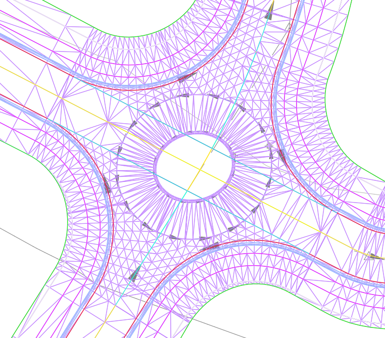 The software will automatically assign profiles to the roundabout alignments based on the design surface, as well as trimming up the intersection with the