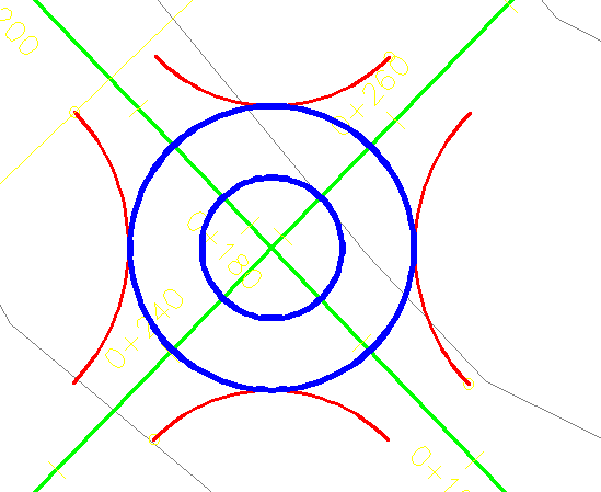 The two Blue alignments define the roundabout extents.