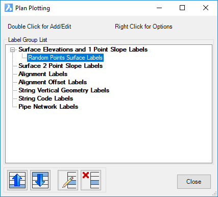 Lists the different types of labels that can be created. Double click on one of these to create a new Label Group of that type. Selecting a label group will display buttons with options to reorder the groups, edit and delete groups of labels Surface Elevations an d1 Point Slope Label