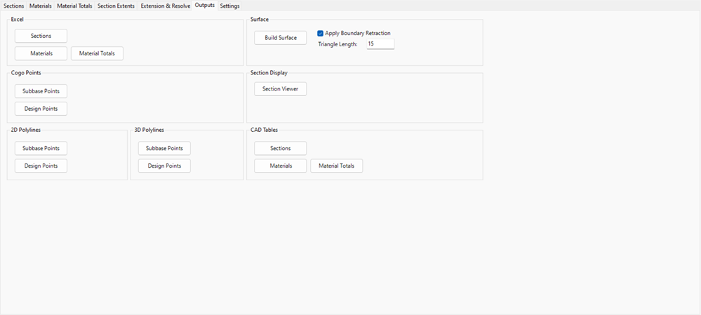 Add an Extension & Resolve entry Add Defaults Adds 8 entries controlling all cut/fill conditions where users can set up how to resolve the cut/fill areas. These cover the behaviour of the subgrade and design surfaces for cut and fill conditions left and right of the centreline Delete Delete anentry Clip subgrade at extents If ticked on, any subgrade outside extension is ignored for calculating the subgrade width extent Save Save the inputs to file Open Load and saved inputs Calculate String Update calculations after editing Extension & Resolve entries Outputs Tab