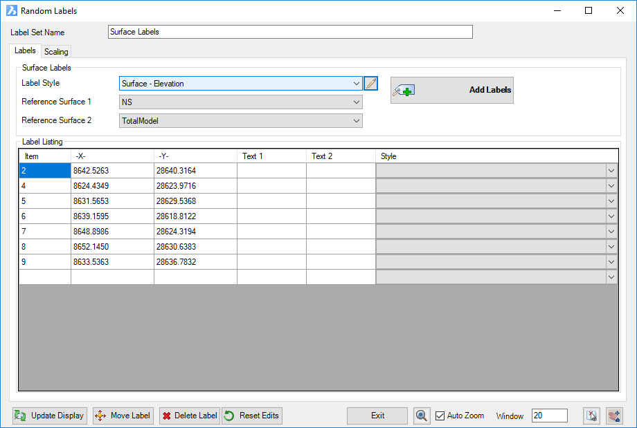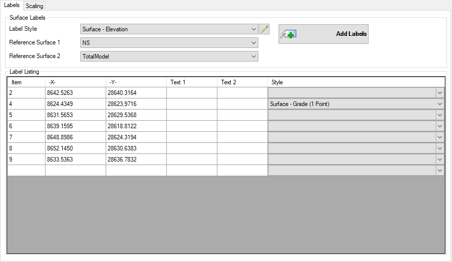 The user can produce a series of label styles in the drawing each with its own predefined style. The styles created can be used for other projects and stored within the global settings for inclusion in new projects. Label Styles are managed via the Label Styles command for Surface Labels.