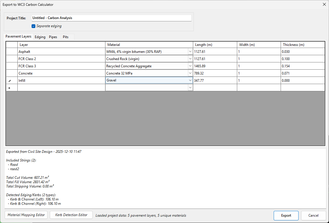 WC3 is a software service providing comprehensive embodied carbon calculations for civil infrastructure. This command exports civil design data to the WC3 format for carbon footprint analysis. Users can review and edit pavement layers, edging, pipes, and pits before exporting to a JSON format for carbon calculation.