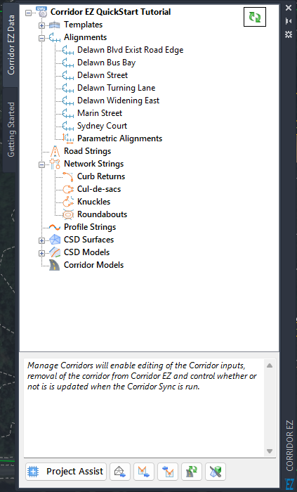The Toolspace in Corridor EZ provides the simplest, direct and user friendly access to core settings and all Corridor EZ objects. The Toolspace groups objects together and sorts them in a workflow from top to bottom.